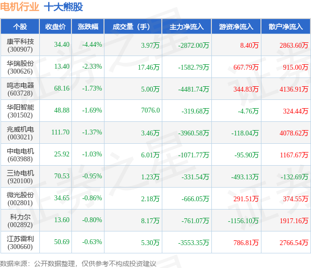 个股表现方面,电机行业当日领跌股为康平科技(300907),该股当日报收34.4,下跌4.44%,成交量3.97万,主力资金净流出2872.0万元。华瑞股份(300626)以下跌2.33%紧随其后,该股当日成交量17.46万,主力资金净流出1582.79万元。除此之外,鸣志电器(603728)、华阳智能(301502)、兆威机电(003021)均进入当日熊股之列。具体个股列表见下表: