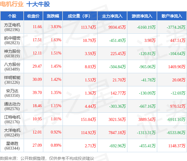 个股表现方面,电机行业当日领涨股为方正电机(002196),该股当日报收11.66,上涨3.83%,成交量113.74万,主力资金净流入9934.45万元。凯中精密(002823)以上涨1.63%紧随其后,该股当日成交量10.79万,主力资金净流出451.49万元。除此之外,神力股份(603819)、八方股份(603489)、祥明智能(301226)均进入当日牛股之列。具体个股列表见下表:
