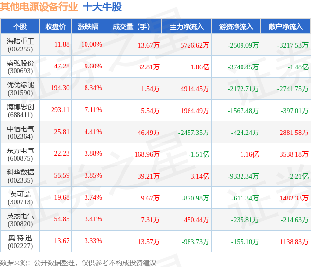 个股表现方面,其他电源设备行业当日领涨股为海陆重工(002255),该股当日报收11.88,上涨10.0%,成交量13.67万,主力资金净流入5726.62万元。盛弘股份(300693)以上涨9.6%紧随其后,该股当日成交量32.81万,主力资金净流入1.86亿元。除此之外,优优绿能(301590)、海博思创(688411)、中恒电气(002364)均进入当日牛股之列。具体个股列表见下表: