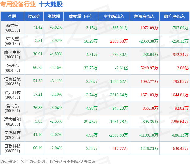 个股表现方面,专用设备行业当日领跌股为新益昌(688383),该股当日报收71.42,下跌6.82%,成交量3.15万,主力资金净流出365.01万元。ST太重(600169)以下跌4.92%紧随其后,该股当日成交量50.29万,主力资金净流入2309.5万元。除此之外,泰林生物(300813)、英维克(002837)、佰奥智能(300836)均进入当日熊股之列。具体个股列表见下表: