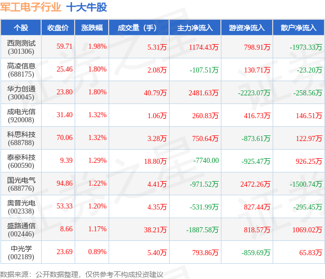 个股表现方面,军工电子行业当日领涨股为西测测试(301306),该股当日报收59.71,上涨1.98%,成交量5.31万,主力资金净流入1174.43万元。高凌信息(688175)以上涨1.8%紧随其后,该股当日成交量2.08万,主力资金净流出107.51万元。除此之外,华力创通(300045)、成电光信(920008)、科思科技(688788)均进入当日牛股之列。具体个股列表见下表: