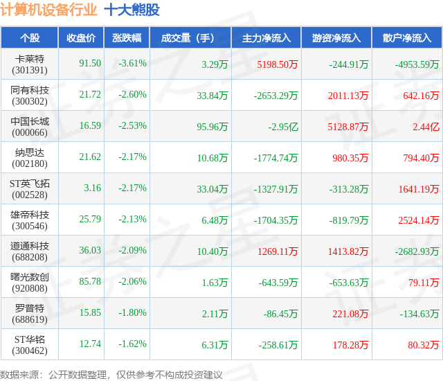 个股表现方面,计算机设备行业当日领跌股为卡莱特(301391),该股当日报收91.5,下跌3.61%,成交量3.29万,主力资金净流入5198.5万元。同有科技(300302)以下跌2.6%紧随其后,该股当日成交量33.84万,主力资金净流出2653.29万元。除此之外,中国长城(000066)、纳思达(002180)、ST英飞拓(002528)均进入当日熊股之列。具体个股列表见下表: