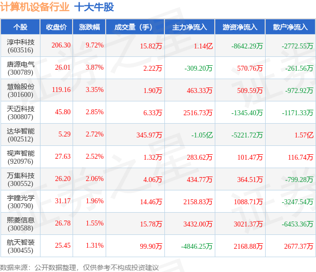 个股表现方面,计算机设备行业当日领涨股为淳中科技(603516),该股当日报收206.3,上涨9.72%,成交量15.82万,主力资金净流入1.14亿元。唐源电气(300789)以上涨3.87%紧随其后,该股当日成交量2.22万,主力资金净流出309.2万元。除此之外,慧翰股份(301600)、天迈科技(300807)、达华智能(002512)均进入当日牛股之列。具体个股列表见下表: