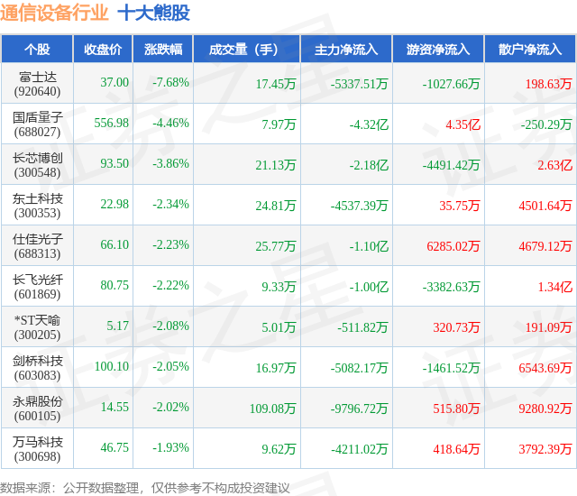 个股表现方面,通信设备行业当日领跌股为富士达(920640),该股当日报收37.0,下跌7.68%,成交量17.45万,主力资金净流出5337.51万元。国盾量子(688027)以下跌4.46%紧随其后,该股当日成交量7.97万,主力资金净流出4.32亿元。除此之外,长芯博创(300548)、东土科技(300353)、仕佳光子(688313)均进入当日熊股之列。具体个股列表见下表: