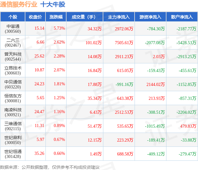 个股表现方面,通信服务行业当日领涨股为中富通(300560),该股当日报收15.14,上涨5.73%,成交量34.32万,主力资金净流入2972.06万元。二六三(002467)以上涨2.62%紧随其后,该股当日成交量101.02万,主力资金净流入7505.61万元。除此之外,普天科技(002544)、立昂技术(300603)、中贝通信(603220)均进入当日牛股之列。具体个股列表见下表: