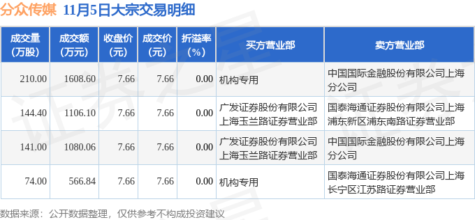 证券之星消息,11月5日分众传媒发生大宗交易,交易数据如下: