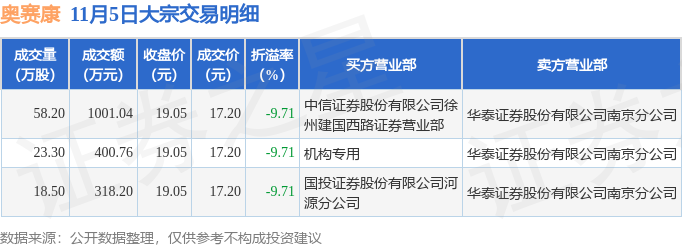 证券之星消息,11月5日奥赛康发生大宗交易,交易数据如下: