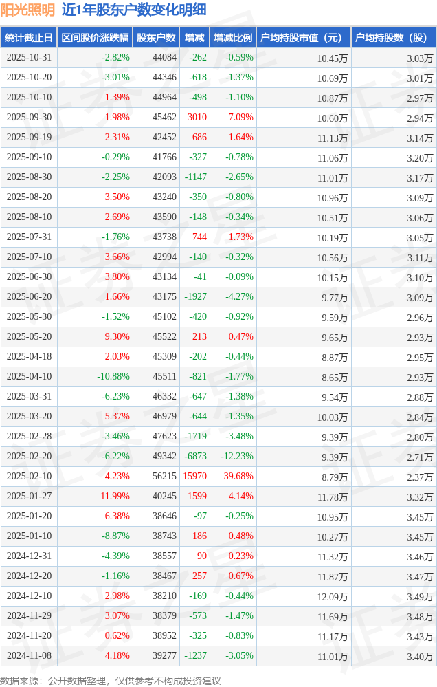 从股价来看,2025年10月20日至2025年10月31日,阳光照明区间跌幅为2.82%,在此期间股东户数减少262.0户,减幅为0.59%。