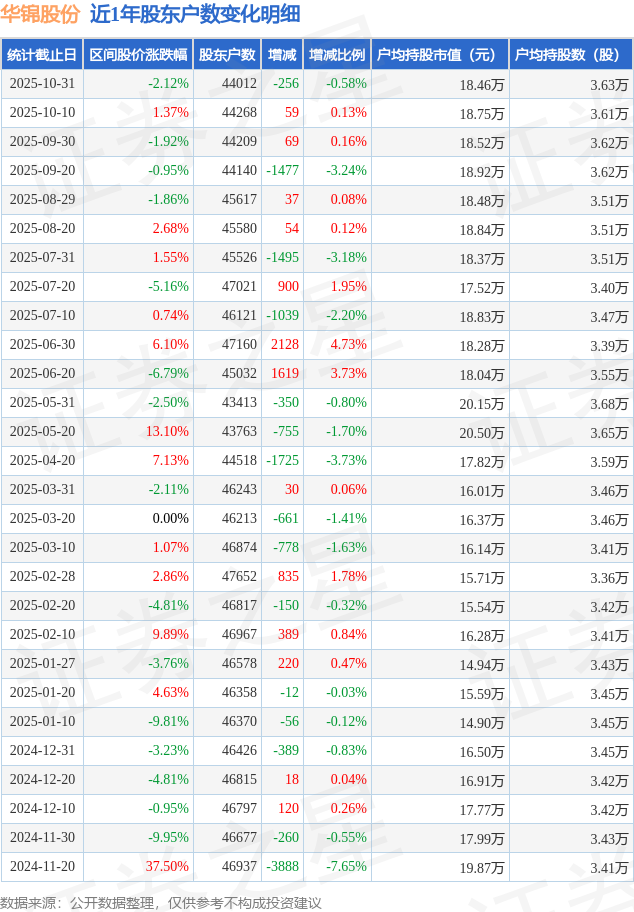 从股价来看,2025年10月10日至2025年10月31日,华锦股份区间跌幅为2.12%,在此期间股东户数减少256.0户,减幅为0.58%。