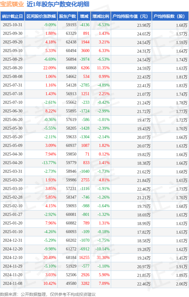 从股价来看,2025年9月30日至2025年10月31日,宝武镁业区间跌幅为9.09%,在此期间股东户数减少4136.0户,减幅为6.53%。