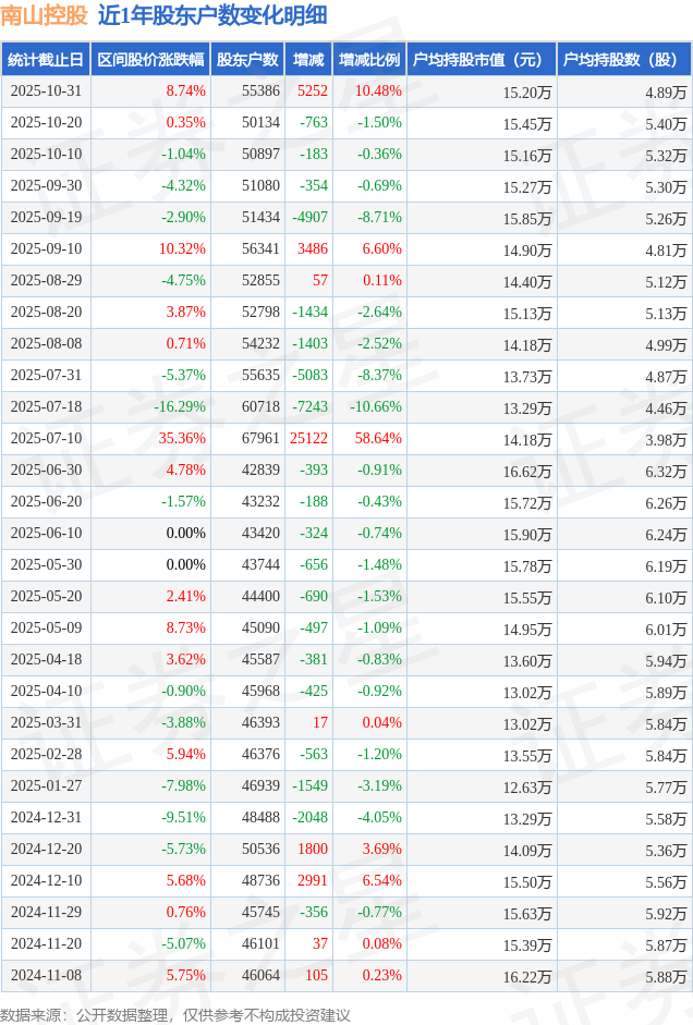 从股价来看,2025年10月20日至2025年10月31日,南山控股区间涨幅为8.74%,在此期间股东户数增加5252.0户,增幅为10.48%。