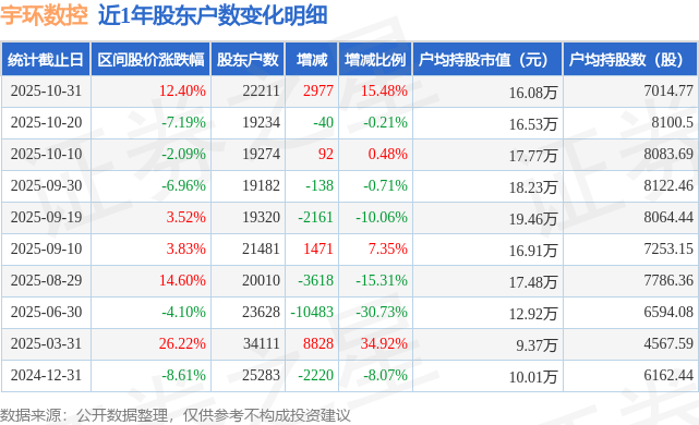 证券之星消息,近日宇环数控披露,截至2025年10月31日公司股东户数为2.22万户,较10月20日增加2977.0户,增幅为15.48%。户均持股数量由上期的8100.0股减少至7015.0股,户均持股市值为16.08万元。