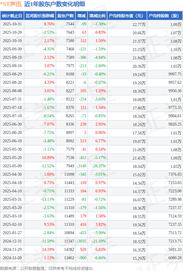 从股价来看,2025年10月20日至2025年10月31日,*ST声迅区间涨幅为8.76%,在此期间股东户数减少99.0户,减幅为1.3%。