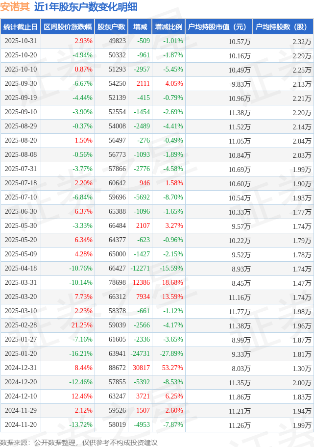 从股价来看,2025年10月20日至2025年10月31日,安诺其区间涨幅为2.93%,在此期间股东户数减少509.0户,减幅为1.01%。