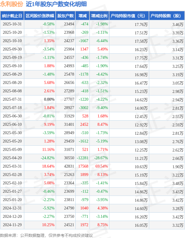 从股价来看,2025年10月20日至2025年10月31日,永利股份区间跌幅为0.58%,在此期间股东户数减少474.0户,减幅为1.98%。