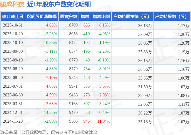 从股价来看,2025年10月20日至2025年10月31日,骏成科技区间涨幅为4.83%,在此期间股东户数增加656.0户,增幅为8.15%。