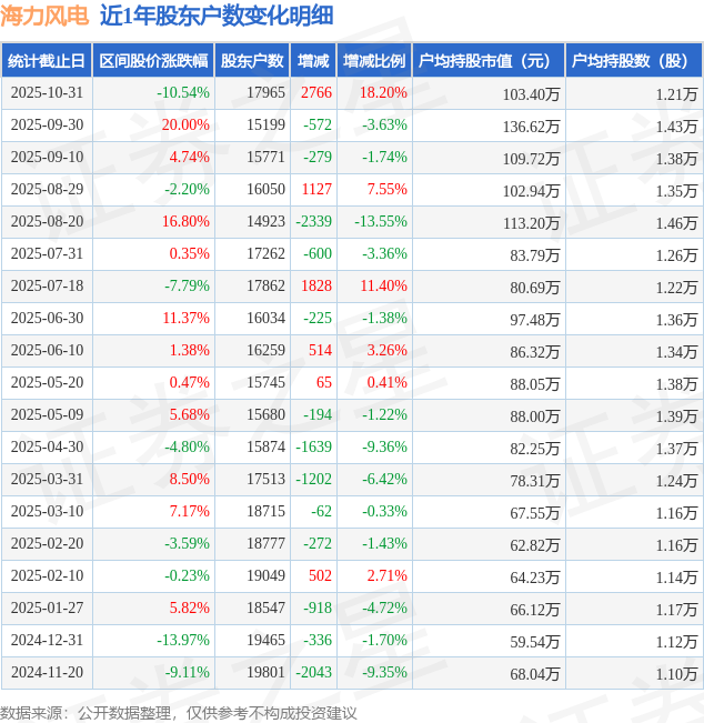 从股价来看,2025年9月30日至2025年10月31日,海力风电区间跌幅为10.54%,在此期间股东户数增加2766.0户,增幅为18.2%。
