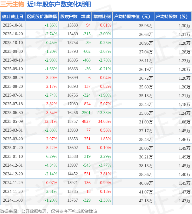 从股价来看,2025年10月20日至2025年10月31日,三元生物区间跌幅为1.36%,在此期间股东户数增加94.0户,增幅为0.61%。