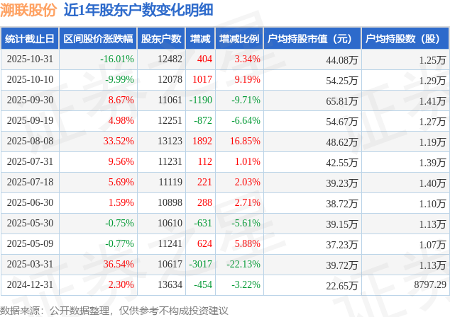 从股价来看,2025年10月10日至2025年10月31日,溯联股份区间跌幅为16.01%,在此期间股东户数增加404.0户,增幅为3.34%。