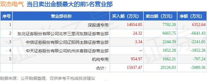 证券之星消息,沪深交易所2025年11月5日公布的交易公开信息显示,双杰电气(300444)因日涨幅达到15%的前5只证券登上龙虎榜。此次是近5个交易日内第1次上榜。