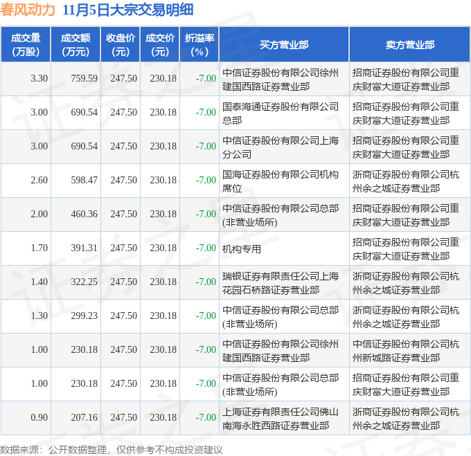 证券之星消息,11月5日春风动力发生大宗交易,交易数据如下: