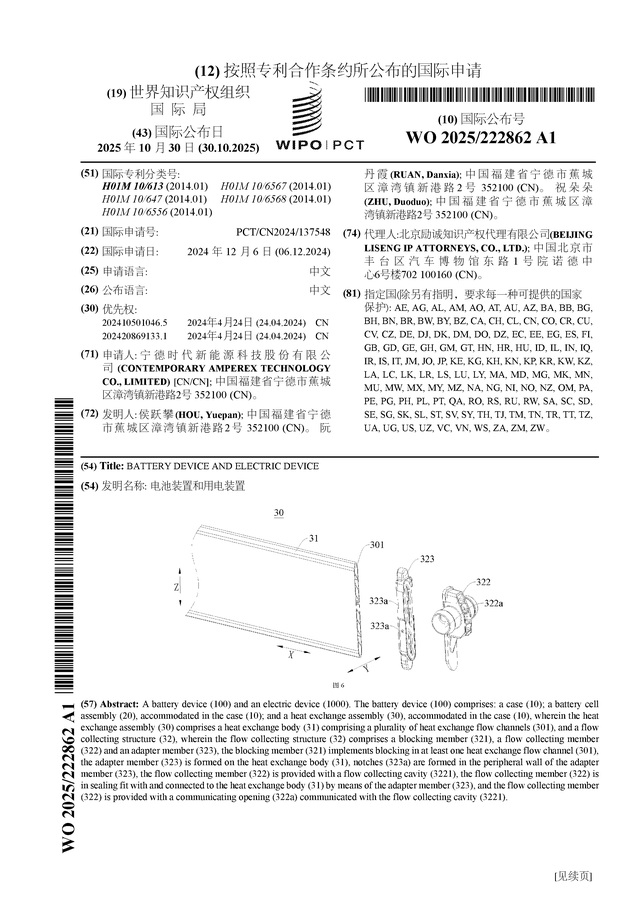 证券之星消息,根据企查查数据显示宁德时代(300750)公布了一项国际专利申请,专利名为“电池装置和用电装置”,专利申请号为PCT/CN2024/137548,国际公布日为2025年10月30日。