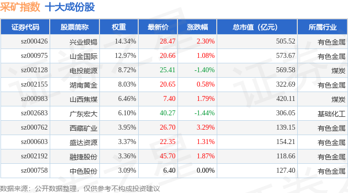 证券之星消息,11月5日,采矿指数(399232)报收于3604.77点,涨1.27%,成交132.61亿元,换手率2.87%。当日该指数成份股中,上涨的有27家,国城矿业以9.42%的涨幅领涨,下跌的有2家,广东宏大以1.44%的跌幅领跌。