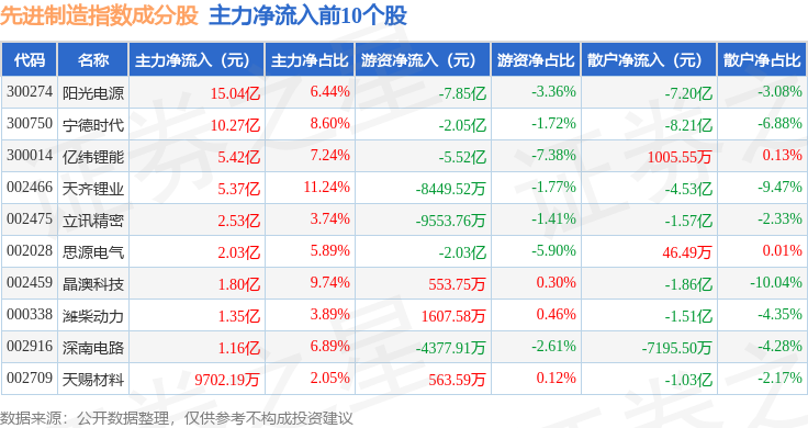 资金流向方面,先进制造(399260)指数成份股当日主力资金净流入合计14.16亿元,游资资金净流出合计9.73亿元,散户资金净流出合计4.43亿元。成份股资金流向详情见下表: