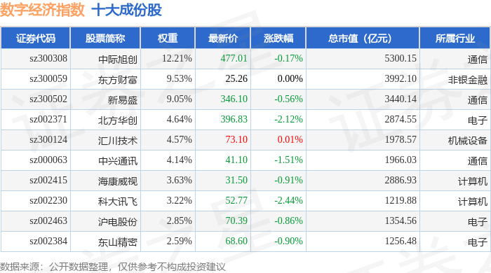 数字经济(399262)指数十大成份股详情如下: