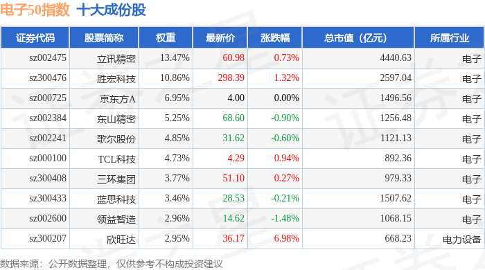 证券之星消息,11月5日,电子50(399281)指数报收于4521.53点,涨0.29%,成交570.48亿元,换手率1.93%。当日该指数成份股中,上涨的有24家,欣旺达以6.98%的涨幅领涨,下跌的有25家,光弘科技以7.95%的跌幅领跌。