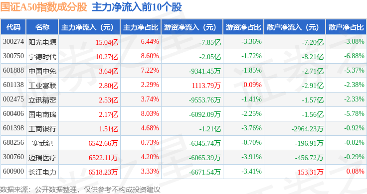 资金流向方面,国证A50(399310)指数成份股当日主力资金净流入合计5210.28万元,游资资金净流出合计1.14亿元,散户资金净流入合计6211.57万元。成份股资金流向详情见下表: