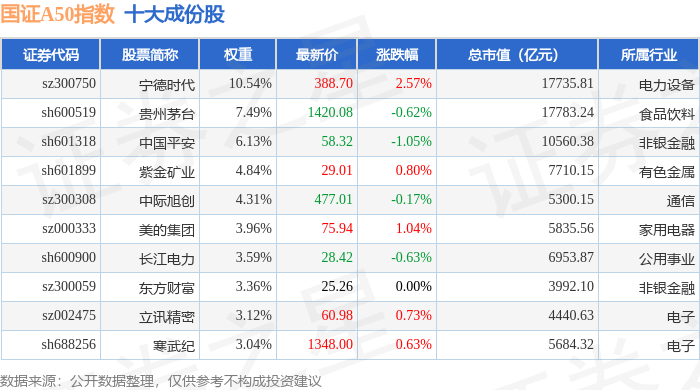 国证A50(399310)指数十大成份股详情如下: