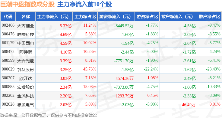 资金流向方面,巨潮中盘(399315)指数成份股当日主力资金净流出合计22.74亿元,游资资金净流入合计4.19亿元,散户资金净流入合计18.55亿元。成份股资金流向详情见下表:
