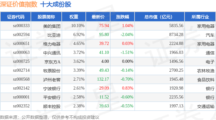 深证价值(399348)指数十大成份股详情如下: