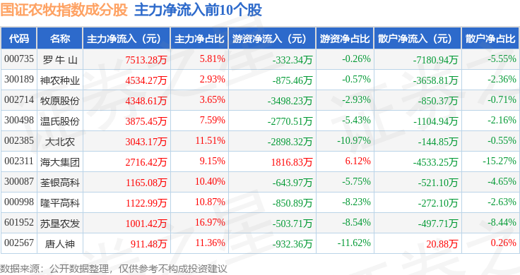 资金流向方面,国证农牧(399435)指数成份股当日主力资金净流出合计1708.26万元,游资资金净流出合计1.38亿元,散户资金净流入合计1.55亿元。成份股资金流向详情见下表: