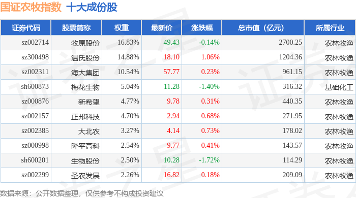 国证农牧(399435)指数十大成份股详情如下: