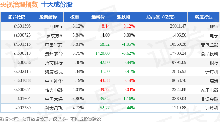 证券之星消息,11月5日,央视治理(399554)指数报收于7611.11点,跌0.23%,成交452.18亿元,换手率0.36%。当日该指数成份股中,上涨的有20家,正泰电器以4.12%的涨幅领涨,下跌的有28家,科大讯飞以2.44%的跌幅领跌。