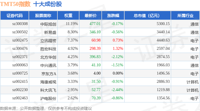 证券之星消息,11月5日,TMT50(399610)指数报收于9161.79点,跌0.53%,成交1194.92亿元,换手率1.75%。当日该指数成份股中,上涨的有13家,欣旺达以6.98%的涨幅领涨,下跌的有35家,深信服以4.54%的跌幅领跌。