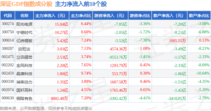 资金流向方面,深证GDP(399648)指数成份股当日主力资金净流入合计3.05亿元,游资资金净流出合计8.39亿元,散户资金净流入合计5.35亿元。成份股资金流向详情见下表: