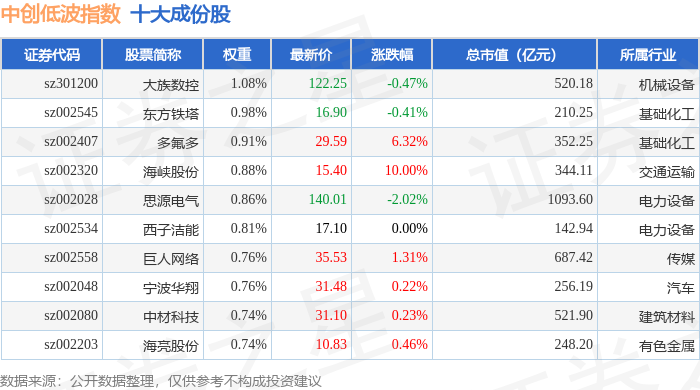 证券之星消息,11月5日,中创低波(399665)指数报收于2330.13点,涨0.63%,成交1217.04亿元,换手率1.49%。当日该指数成份股中,上涨的有121家,海峡股份以10.0%的涨幅领涨,下跌的有74家,楚江新材以2.78%的跌幅领跌。