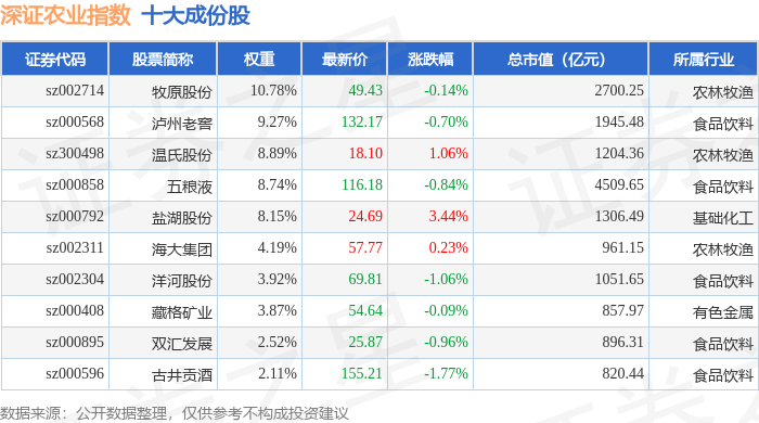 证券之星消息,11月5日,深证农业(399669)指数报收于8517.8点,涨0.26%,成交226.07亿元,换手率1.29%。当日该指数成份股中,上涨的有30家,川恒股份以6.57%的涨幅领涨,下跌的有18家,神州信息以2.92%的跌幅领跌。