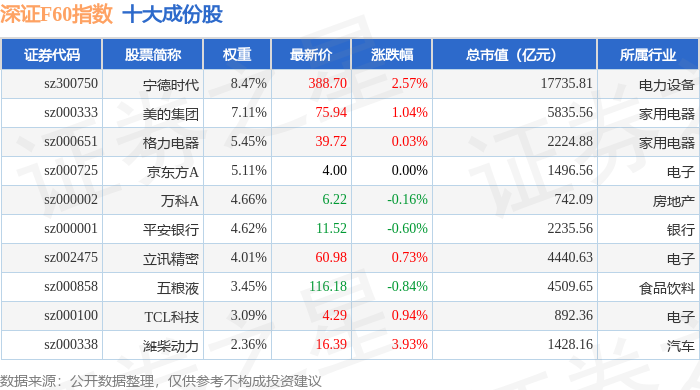 证券之星消息,11月5日,深证F60(399701)指数报收于8062.46点,涨0.42%,成交765.16亿元,换手率0.85%。当日该指数成份股中,上涨的有28家,潍柴动力以3.93%的涨幅领涨,下跌的有29家,中油资本以2.96%的跌幅领跌。