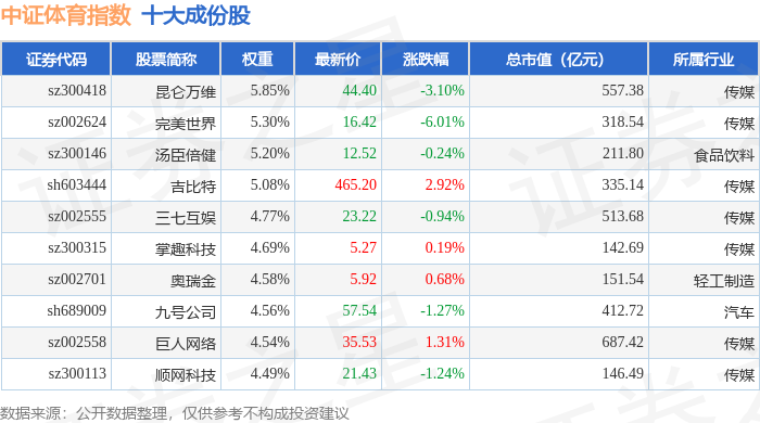 中证体育(399804)指数十大成份股详情如下: