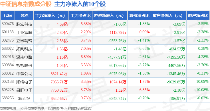 资金流向方面,中证信息(399935)指数成份股当日主力资金净流出合计64.17亿元,游资资金净流入合计16.31亿元,散户资金净流入合计47.86亿元。成份股资金流向详情见下表: