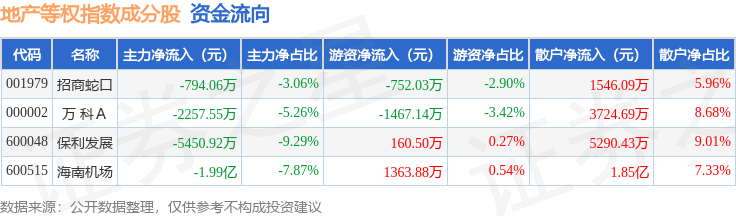 资金流向方面,地产等权(399983)指数成份股当日主力资金净流出合计2.84亿元,游资资金净流出合计694.79万元,散户资金净流入合计2.91亿元。成份股资金流向详情见下表: