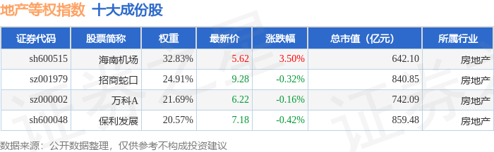 证券之星消息,11月5日,地产等权(399983)指数报收于2346.56点,涨1.04%,成交38.02亿元,换手率1.59%。当日该指数成份股中,上涨的有1家,海南机场以3.5%的涨幅领涨,下跌的有3家,保利发展以0.42%的跌幅领跌。