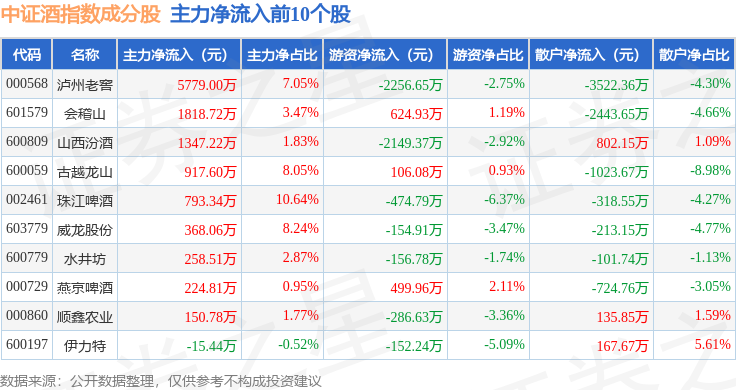 资金流向方面,中证酒(399987)指数成份股当日主力资金净流出合计5.41亿元,游资资金净流入合计2.24亿元,散户资金净流入合计3.16亿元。成份股资金流向详情见下表: