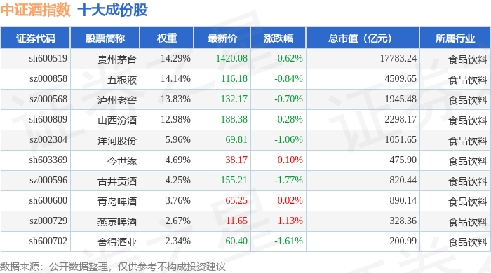 证券之星消息,11月5日,中证酒(399987)指数报收于5438.68点,跌0.49%,成交125.87亿元,换手率0.71%。当日该指数成份股中,上涨的有14家,会稽山以3.12%的涨幅领涨,下跌的有13家,古井贡酒以1.77%的跌幅领跌。