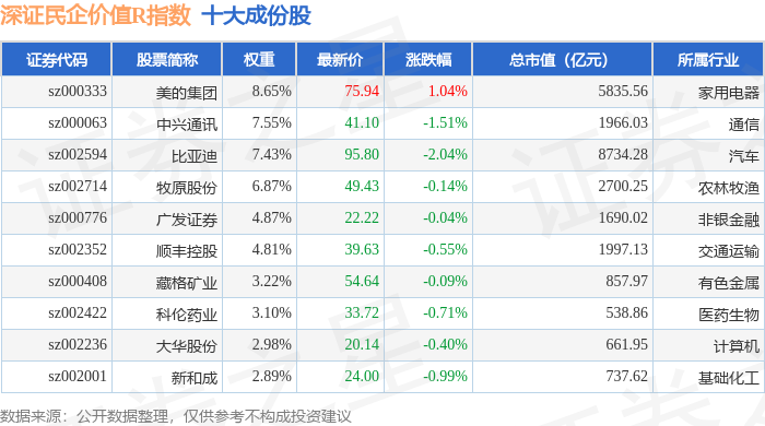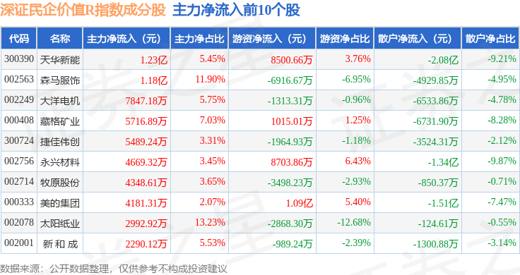资金流向方面,深证民企价值R(470072)指数成份股当日主力资金净流出合计12.34亿元,游资资金净流入合计2.86亿元,散户资金净流入合计9.48亿元。成份股资金流向详情见下表: