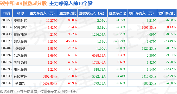 资金流向方面,碳中和50R(480021)指数成份股当日主力资金净流入合计22.19亿元,游资资金净流出合计11.05亿元,散户资金净流出合计11.14亿元。成份股资金流向详情见下表: